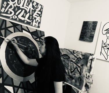Navigating between structured abstraction and symbolic figuration, her work engages in a dialogue with history while asserting a distinctly contemporary visual language.
